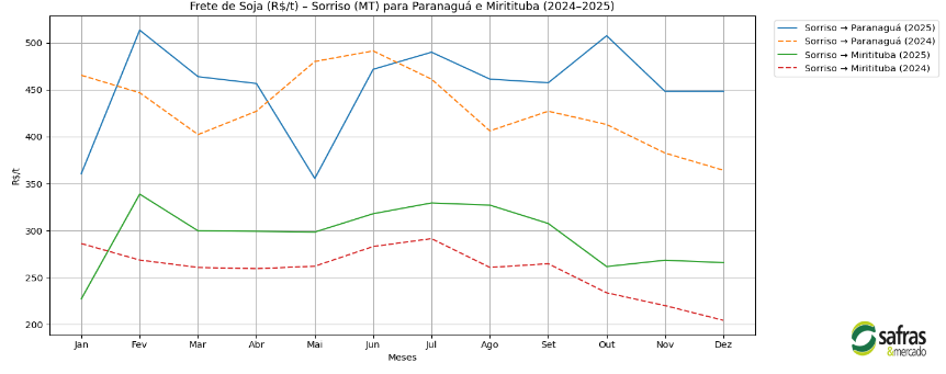 A análise dos fretes saindo de Sorriso (MT), considerando 2024 e 2025 e ajustados para valores reais pela inflação, evidencia diferenças estruturais entre rotas. O escoamento via Miritituba apresenta custos consistentemente inferiores ao de Paranaguá, reforçando a vantagem logística do Arco Norte.