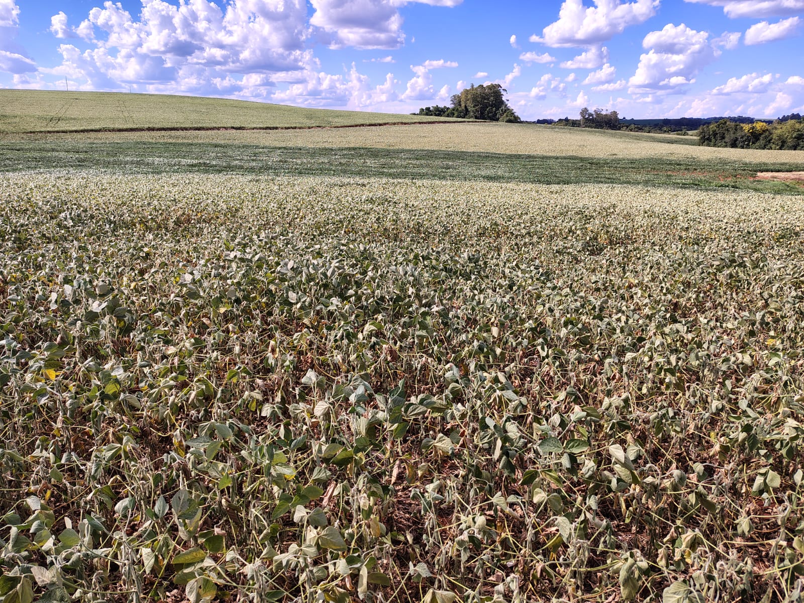 O Soja Brasil conversou com o produtor rural Maicon Abel Kummer, de Tapera (RS), que relata que as lavouras semeadas entre a segunda quinzena de novembro e dezembro estão atualmente na fase de enchimento de grãos (R5.1 a R5.4), período decisivo para a definição da produtividade, e já começam a sentir com mais intensidade os efeitos da falta de umidade no solo.