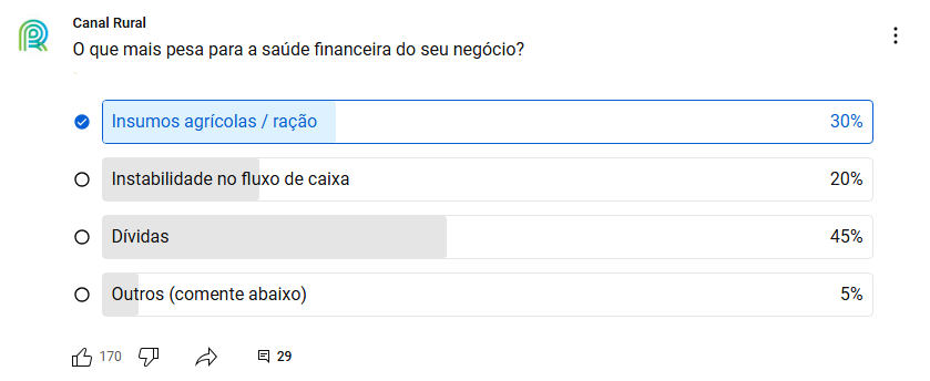Entre os participantes da enquete, a maior preocupação dos produtores, apontada por 45% dos respondentes, são as dívidas. Em seguida, 30% destacaram o custo dos insumos agrícolas e da ração, enquanto 20% mencionaram a instabilidade no fluxo de caixa. Outros fatores foram citados por 5% dos participantes.