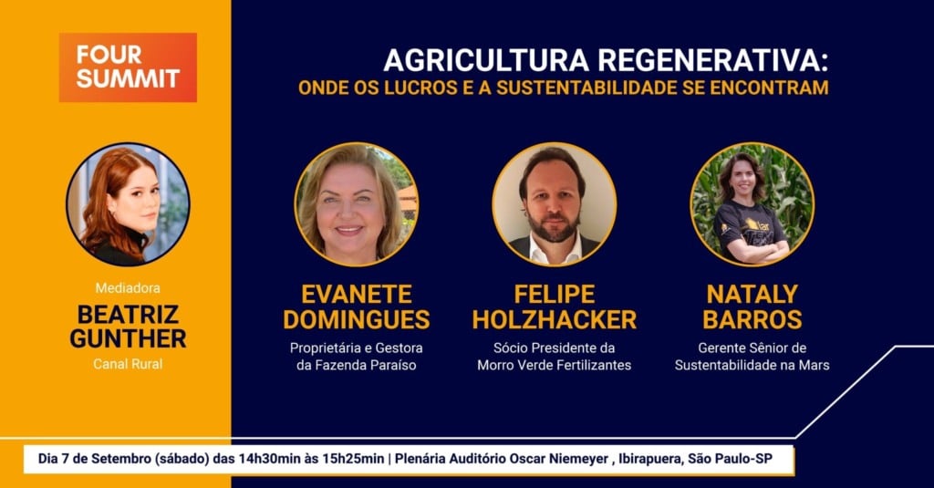 Neste sábado (7), das 14h20 às 15h30, o Auditório Oscar Niemeyer, em São Paulo, será palco do painel “Agricultura regenerativa: onde lucros e sustentabilidade se encontram“. O evento Four Summit reunirá especialistas para discutir os desafios e as oportunidades que a agricultura regenerativa oferece ao Brasil, com foco em aumentar a rentabilidade agrícola sem comprometer o meio ambiente.