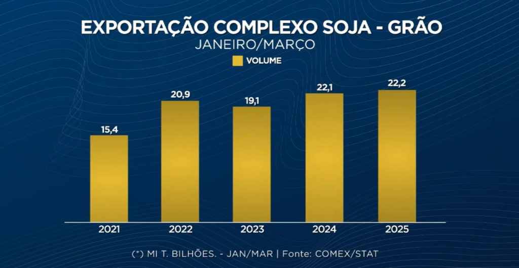 Nos três primeiros meses de 2025, o Brasil exportou 22,2 milhões de toneladas de soja em grão, um leve aumento em relação às 22,1 milhões registradas no mesmo período de 2024. A expectativa para o ano é ainda mais otimista: a projeção é embarcar 108 milhões de toneladas, superando os 102 milhões de 2023 e os 98,5 milhões de 2024.