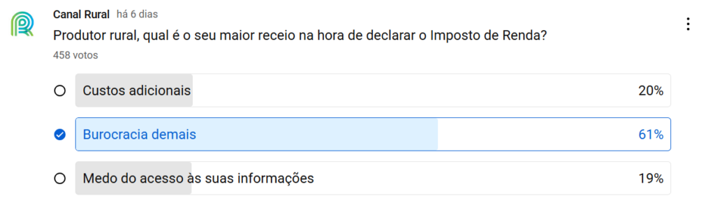 Na interatividade da semana, perguntamos o maior receio na hora de declarar o imposto de renda. O resultado revelou que 61% dos produtores rurais apontam a burocracia como o principal desafio na hora de fazer a declaração.