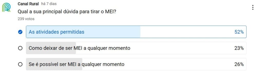 A enquete mostrou que 52% dos participantes têm como principal dúvida para se tornar Microempreendedor Individual (MEI) as atividades permitidas nesse regime.
