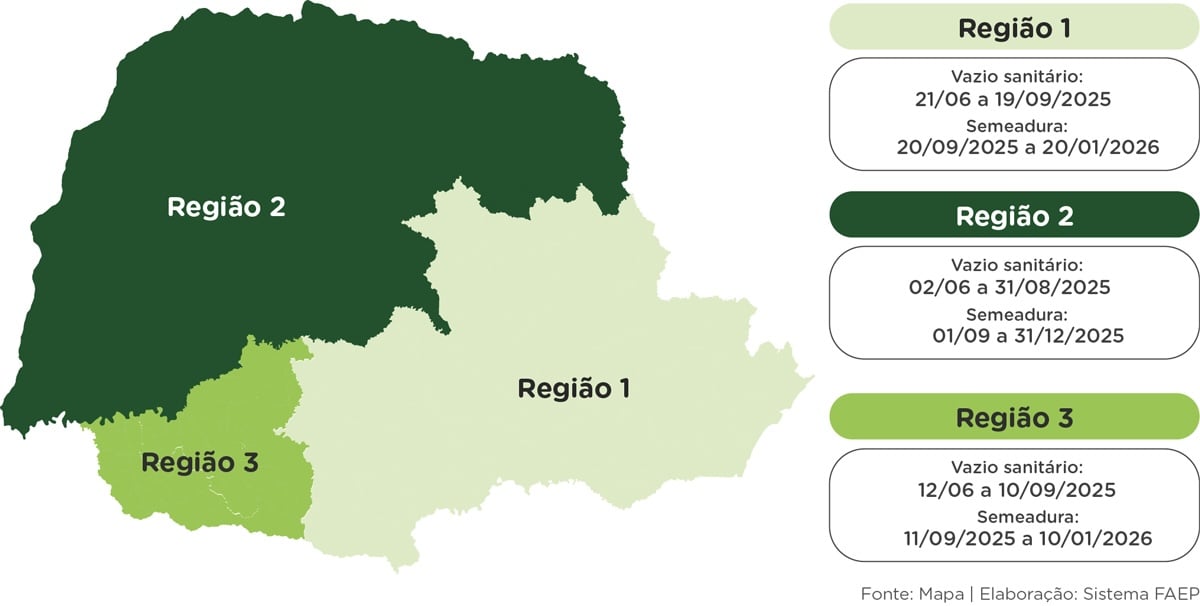 Na região 1, o plantio só poderá começar a partir de 20 de setembro. Na região 2, o plantio terá início um pouco antes, a partir de 1º de setembro. Para a região 3, que engloba os municípios do Sudoeste do estado, a ADAPAR propôs uma alteração, antecipando em 12 dias o início do vazio sanitário, de 22 de junho para 10 de junho de 2025, com o início da semeadura em 11 de setembro.