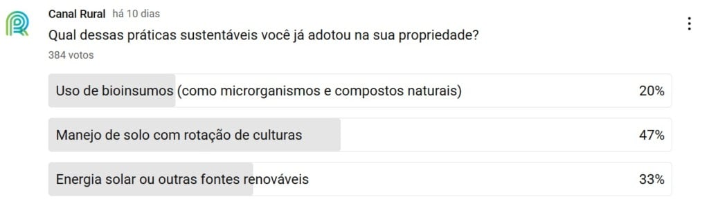 Na interatividade da semana, perguntamos: Quais dessas práticas (uso de bioinsumos, manejo de solo ou energia solar) você já adotou na sua propriedade?