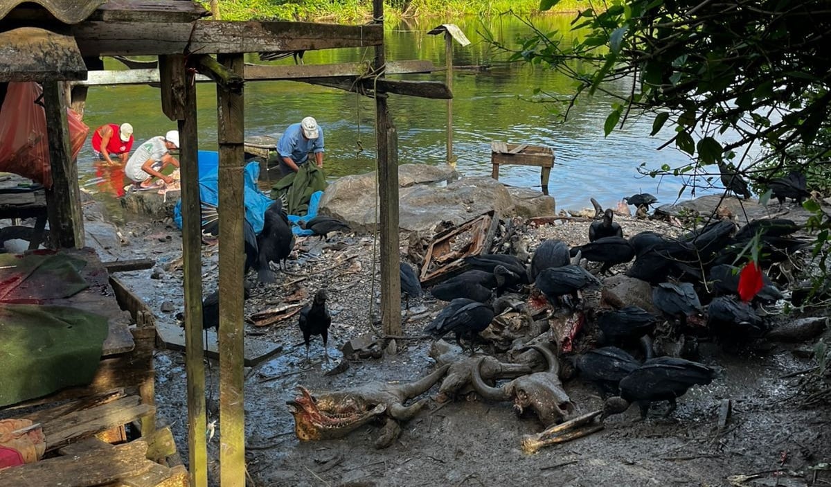 Além das irregularidades sanitárias, a equipe de fiscalização flagrou o descarte inadequado de resíduos provenientes dos abates às margens de um curso d’água.