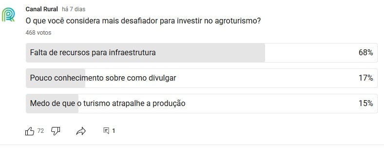 Na interatividade da semana, perguntamos: O que você considera mais desafiador para investir no agroturismo? A pesquisa mostrou que 68% apontam a falta de recursos para infraestrutura como o maior desafio. Outros 17% citaram a dificuldade em divulgar e 15% têm medo de que o turismo atrapalhe a produção.