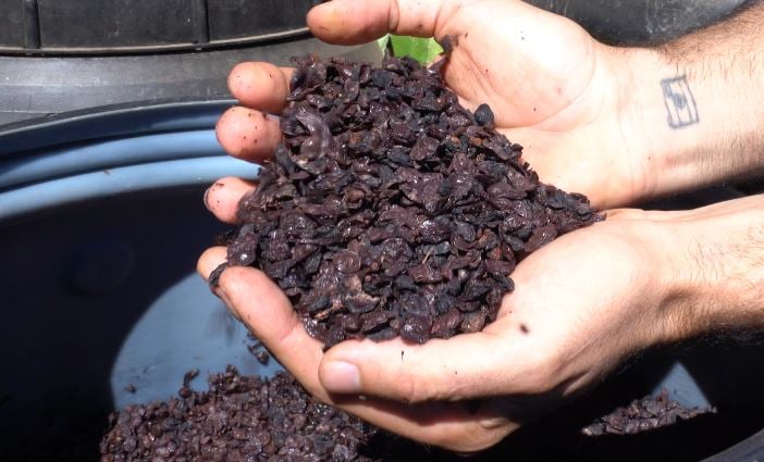 Em vez de depender exclusivamente da ração tradicional, Pedro decidiu investir em uma alimentação natural e circular. Após a produção do mosto, ele busca o bagaço da uva já prensado, rico em antioxidantes presentes na casca e na semente. “Os animais adoram mastigar a semente, que é como uma castanha”, explica ele.