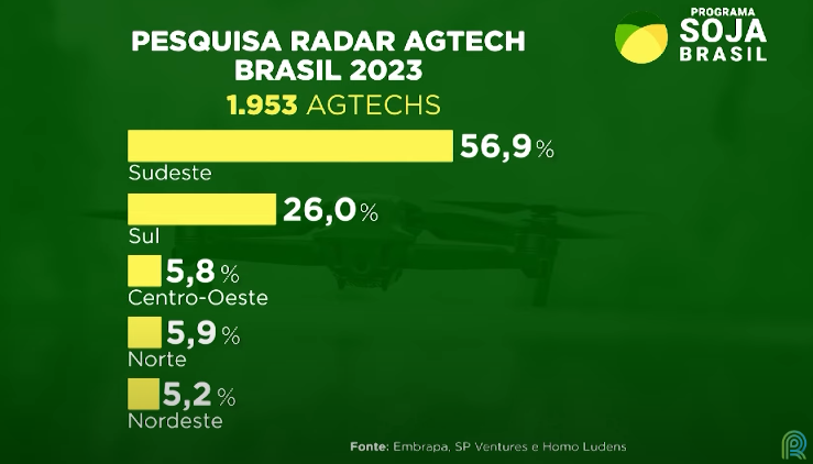 Atualmente, o Brasil conta com quase 2.000 startups que oferecem serviços variados para o agronegócio. Conforme a pesquisa Radar Agtech Brasil 2023, a maior concentração está nas regiões Sudeste e Sul. Destaca-se a cidade de São Paulo, que abriga 43,2% do total nacional e mais startups do que as seis próximas cidades do ranking.