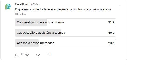 Na interatividade da semana, perguntamos: O que mais pode fortalecer o pequeno produtor nos próximos anos? O resultado revelou um retrato claro do pequeno produtor brasileiro. Com 46% dos votos, a capacitação e assistência técnica aparecem como o principal caminho para o fortalecimento do campo, sinal de que o produtor quer aprender, inovar e gerir melhor sua atividade.