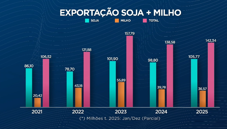 Em relação a 2025, o volume já superou o total do ano anterior, com 106 milhões de toneladas de soja e 36,5 milhões de milho exportadas de janeiro a novembro, totalizando 142,3 milhões de toneladas.