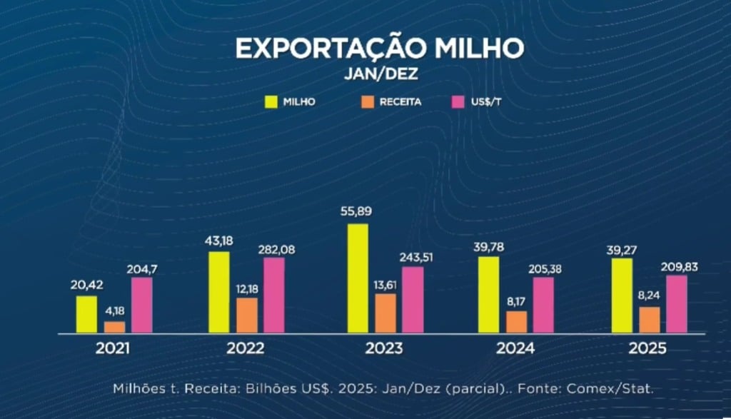 No caso do milho, o cenário se mostra mais favorável. O volume embarcado permanece praticamente estável, enquanto a receita cambial avança, impulsionada pela valorização do dólar por tonelada. A análise aponta que, mesmo sem crescimento expressivo nos embarques, o preço médio pago pelo mercado internacional voltou a subir, sinalizando recuperação após anos de recuo.