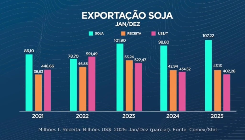 Mesmo com uma semana ainda a ser contabilizada no fechamento do ano, o volume total exportado de soja já alcança um patamar inédito, superando qualquer outro período da série histórica. A avaliação indica que nunca o Brasil embarcou tanta soja quanto em dois mil e vinte e cinco. Apesar desse avanço expressivo nos volumes, a receita cambial apresenta pouca diferença em relação ao ano anterior, o que evidencia queda no valor médio recebido por tonelada.