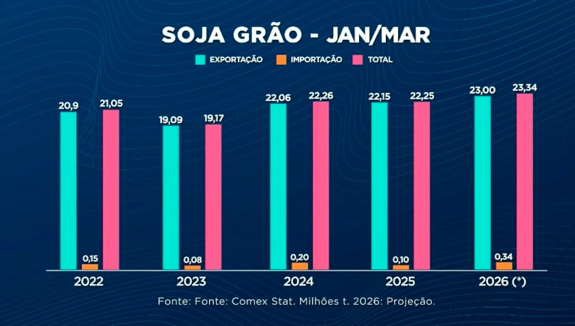 No acumulado de 2025, o país exportou cerca de 108 milhões de toneladas de soja e importou menos de 1 milhão de toneladas. Para 2026, a expectativa é de superar ambos os números, com exportações acima de 110 milhões de toneladas e importações ultrapassando 1 milhão de toneladas.