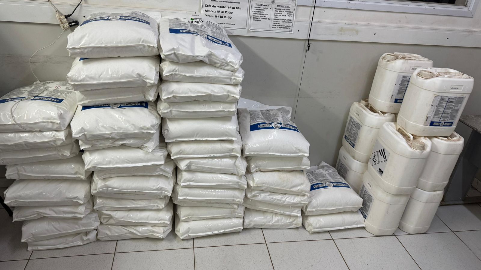 Após conferência, foram contabilizados 400 kg de DK MAX (em pacotes de 10 kg) e 200 litros de BRAVONIL (em galões de 20 litros) sem origem comprovada.