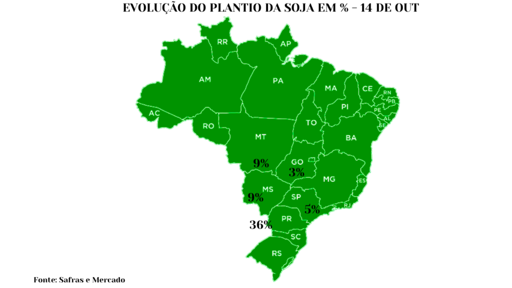 No Paraná, o plantio avança, com 36% da área já semeada, um leve aumento em relação aos 34% do ano anterior. A média histórica para o estado é de 23,4%, evidenciando um desempenho sólido nesta safra.
