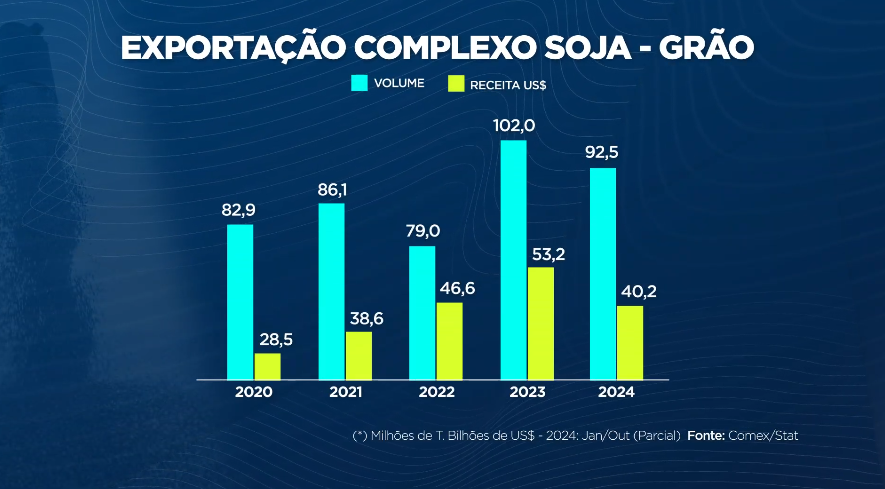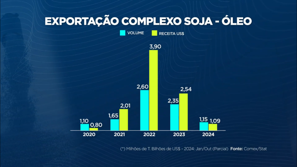 Mesmo com o potencial recorde, a receita cambial das exportações da soja registrou uma queda de 17% entre janeiro e outubro, conforme dados parciais. Essa diminuição ocorre em meio a um panorama otimista para as vendas de grãos e farelo, criando um contraste com as previsões alarmantes para 2025, que apontam uma redução de 40% nas exportações de óleo de soja.