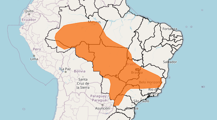 Estão incluídas no alerta do Inmet áreas das regiões Sul (Paraná), Sudeste (São Paulo, Minas Gerais e Espírito Santo), Centro-Oeste (Mato Grosso do Sul, Goiás, Mato Grosso e Distrito Federal) e Norte (Amazonas, Rondônia, Acre, Pará e Tocantins):