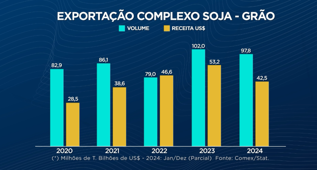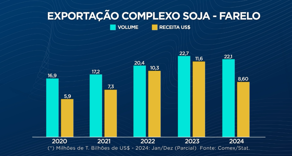 Essa dinâmica do mercado de soja impacta diretamente a balança comercial brasileira. Em 2023, o agronegócio brasileiro exportou 167 bilhões de dólares, com 40% desse total vindo do complexo soja. Para 2024, a expectativa é que a receita cambial do agronegócio caia para 150 bilhões de dólares, com a queda nas exportações e nos preços pagos pelo grão, farelo e óleo de soja.