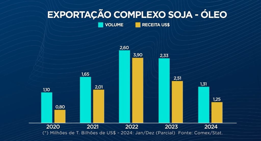 No entanto, o óleo de soja enfrenta um cenário negativo, com uma queda acentuada nas exportações. Até o momento, foram embarcadas 1,31 milhão de toneladas de óleo, contra 2,33 milhões em 2023, o que representa uma queda e retorna aos níveis de 2020. Esse recuo é atribuído à mudança nas demandas globais, especialmente devido à crise energética na Europa, que afetou a compra de óleo.