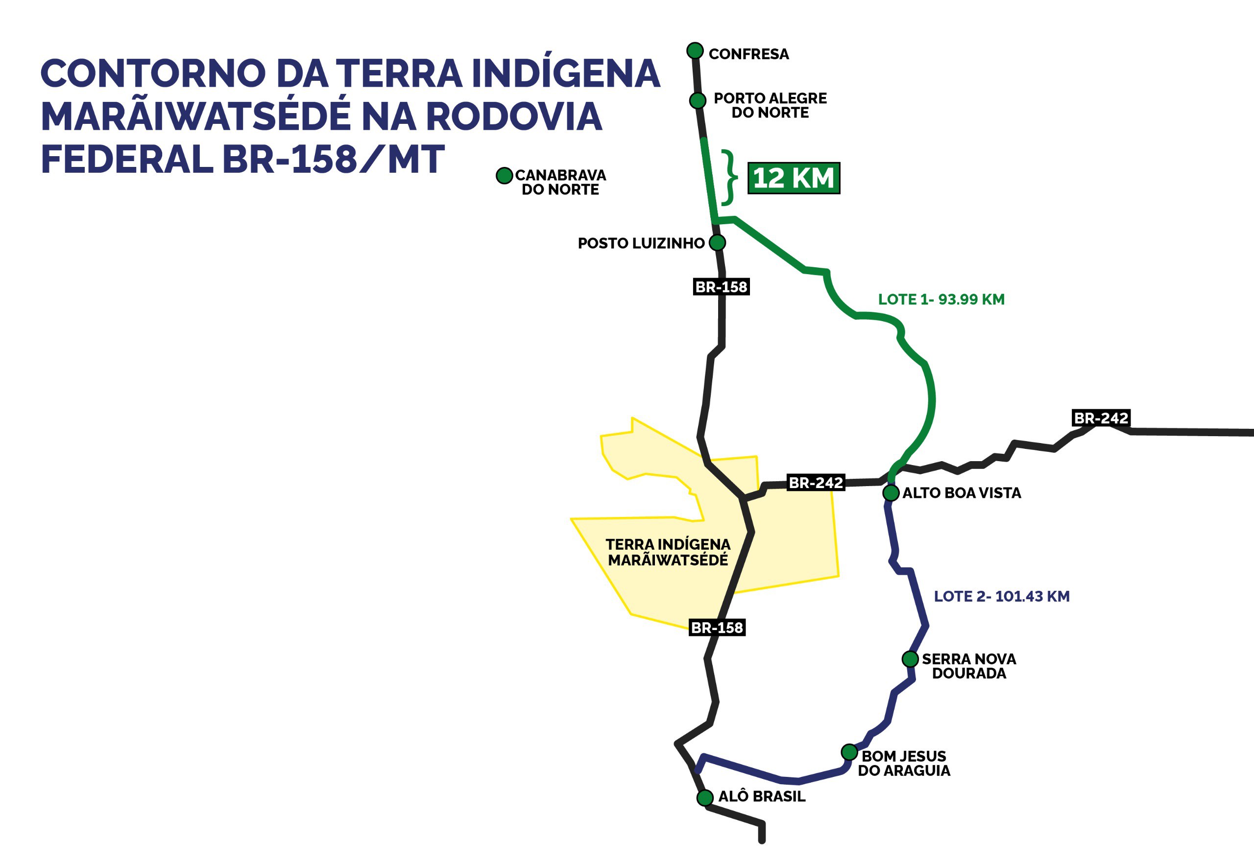 - Lote A: Com 93,99 quilômetros, vai do km 201,2, próximo ao Posto do Luizinho, até o entroncamento da BR-158 com a BR-242/MT, em Alto Boa Vista.