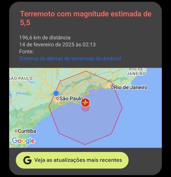 Na madrugada desta sexta-feira (14), moradores de cidades como Ubatuba, São Paulo e Rio de Janeiro receberam um alerta inesperado em celulares Android sobre um suposto terremoto no litoral norte paulista. A notificação indicava possíveis tremores entre 4,4 e 5,5 de magnitude, com epicentro a cerca de 55 quilômetros de Ubatuba.